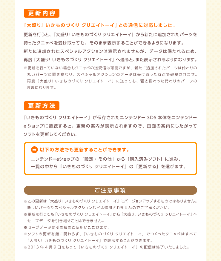 掲示板関連q掲示板(クリエイトーイ広場)ってどう使うの? ゲームについてqクニャペとqrコードの画像の作り方教えて q使えるパーツはどうやって増やすの? q ってどうすれば使えるようになるコメントを書く 大盛り!いきものづくり クリエイトーイ 3DSのキュービックニンジャとクリエイトーイが3DSの改造に利用できることからDL版が配信停止となったのは有名ですが、本体のアップデートでどうにかできなかったのでしょうか? もし、改造に利用できるソフトが「 ニンテンドー3DS いきものづくりクリ
